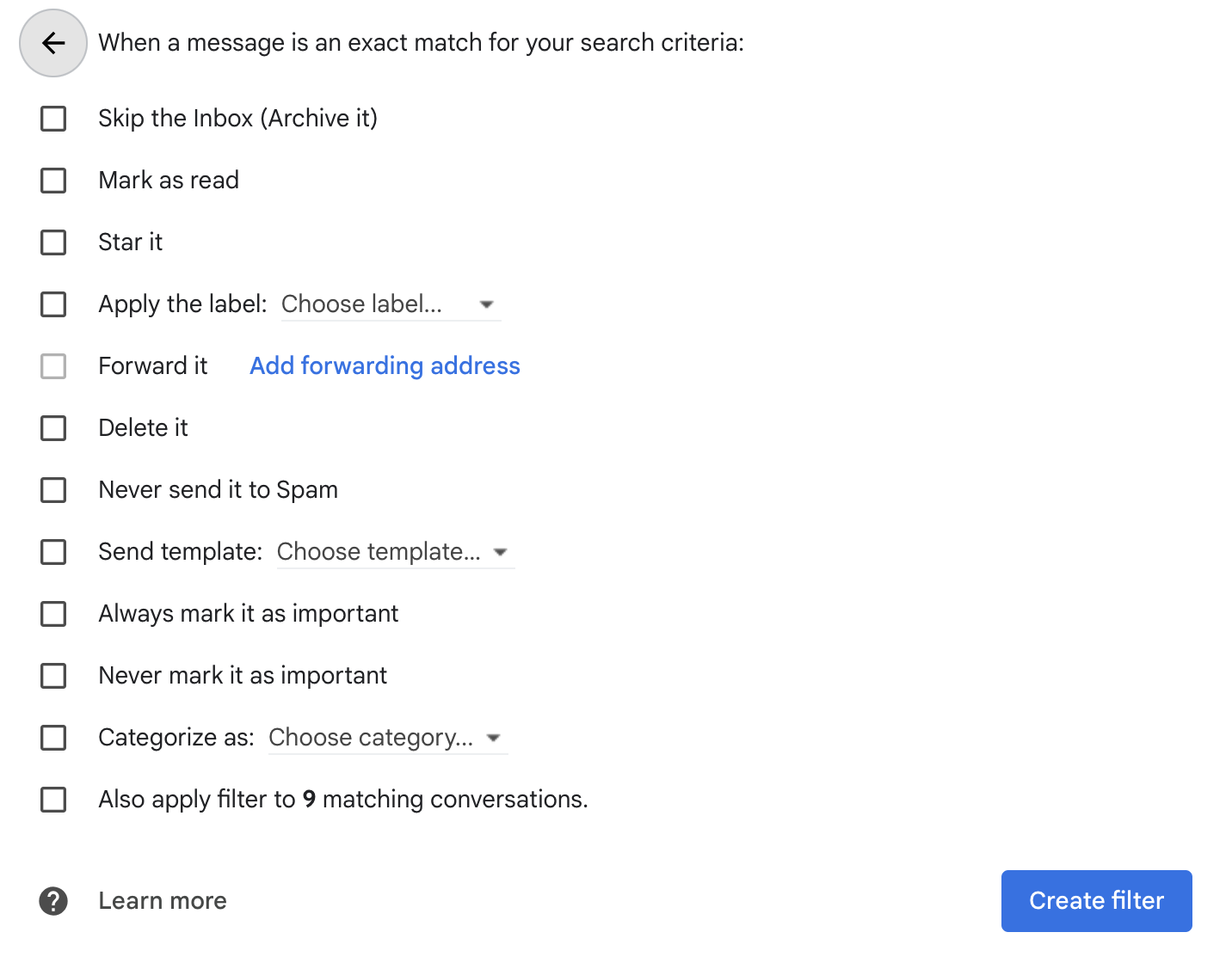 Step 7: Finally, click on “Create filter”. You’ve now created a Gmail rule from scratch.