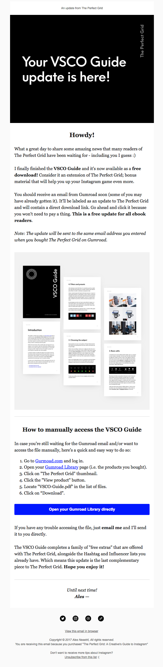 This email uses a laid-back style to guide the reader on how to get their lead magnet. It makes the reader feel at ease while clearly explaining the steps to follow. The tone of the copy is a good example of how to communicate effectively.