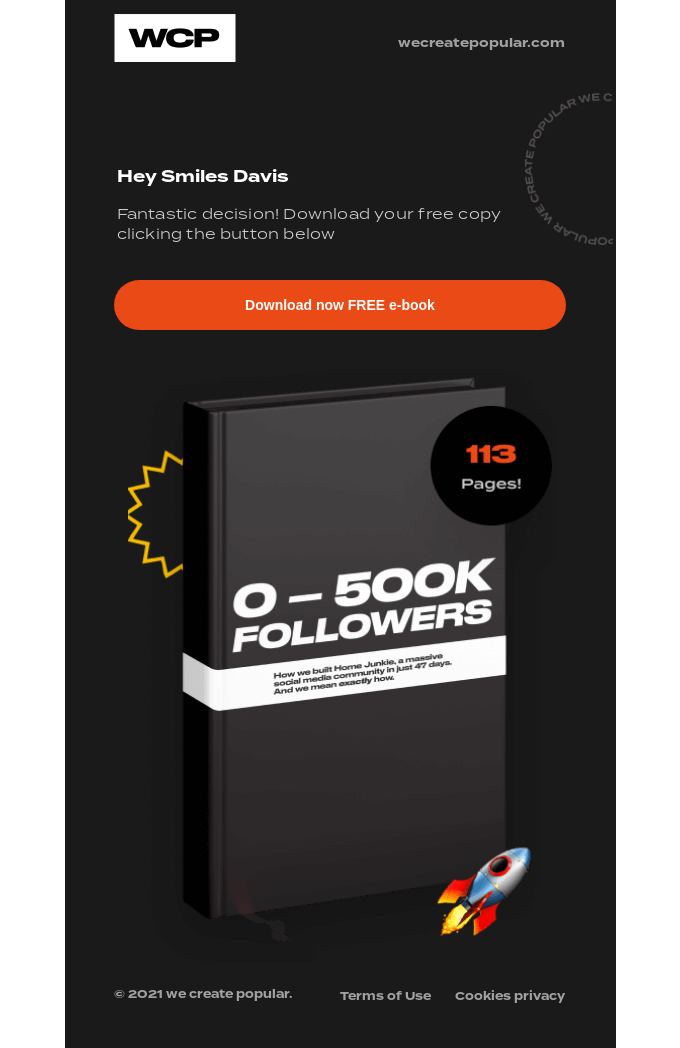 The most compelling aspect is the inclusion of numbers, visible in the subject line and ebook cover. It promises a solid solution: building a community of 500k followers in just 47 days, achievable by reading detailed material spanning over 113 pages.