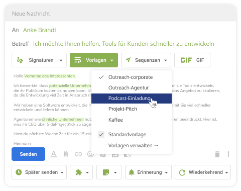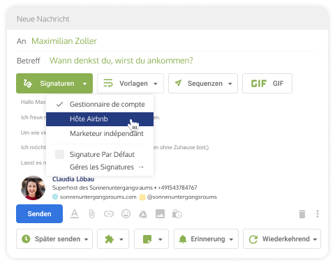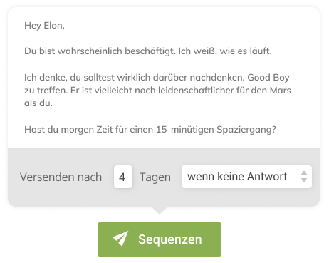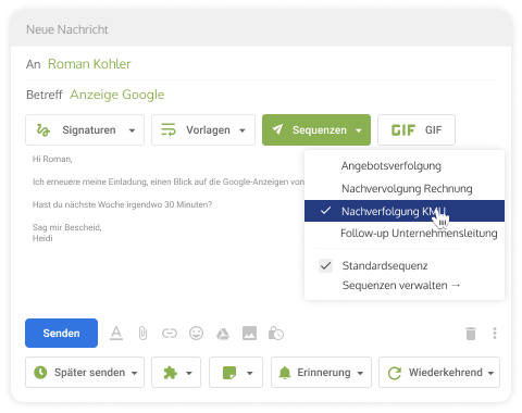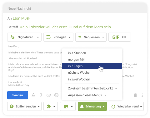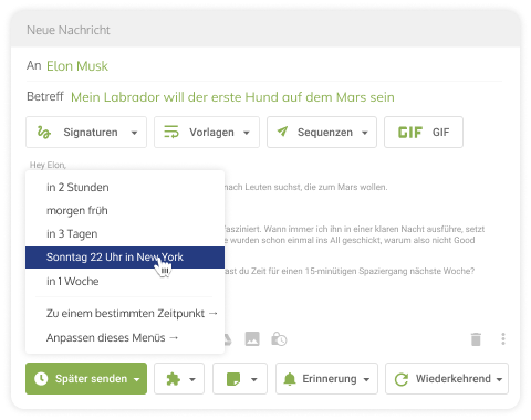Hast du Kunden in verschiedenen Zeitzonen? Fällt dir am Abend etwas ein, aber deine E-Mail soll am nächsten Morgen ankommen? Mit Right Inbox kannst du E-Mails zu einem Zeitpunkt schreiben, der für dich passt, und sie dann zu einem Zeitpunkt versenden lassen, der für deine Empfänger passt.